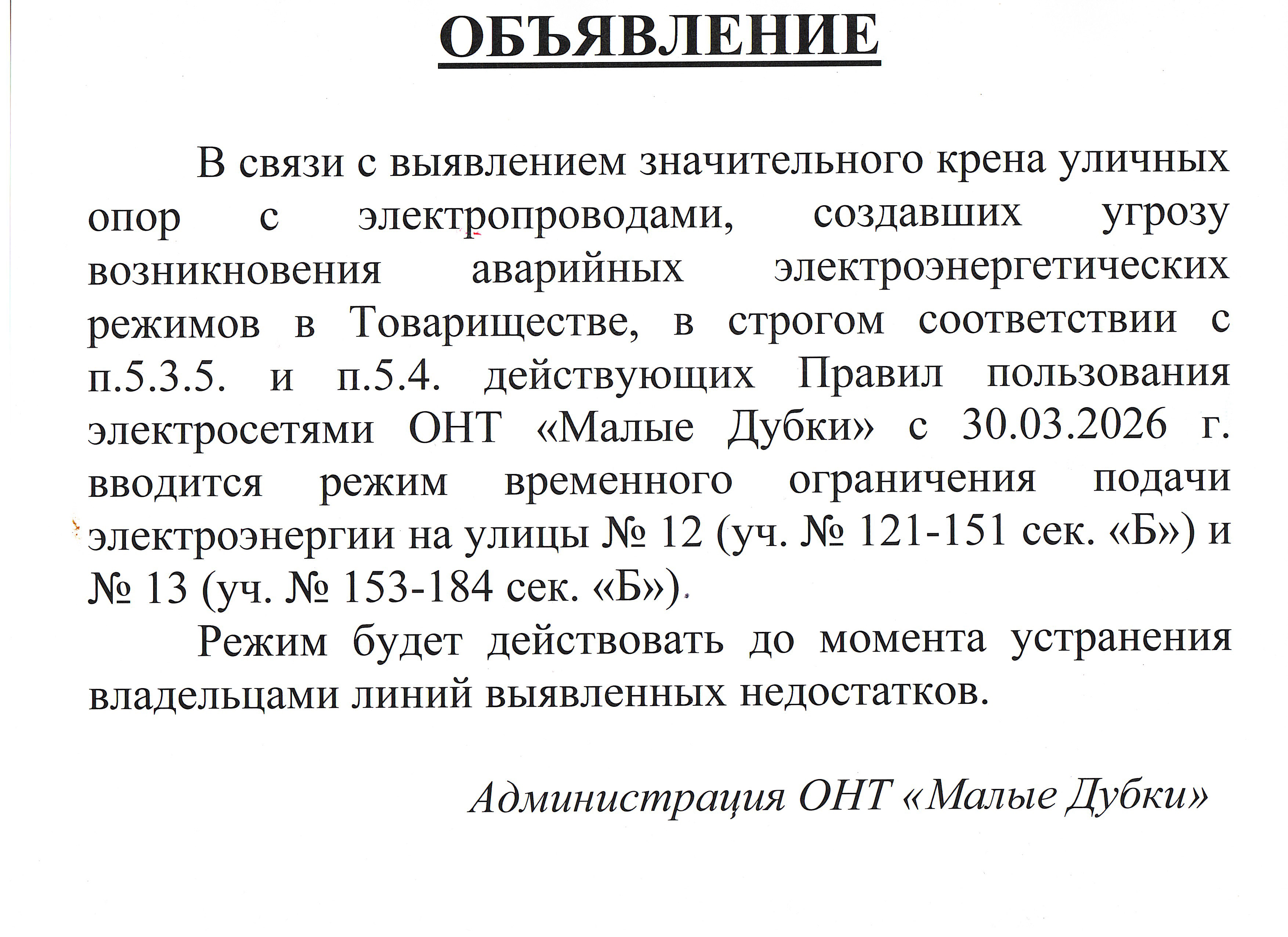 Администрация ОНТ «Малые Дубки»